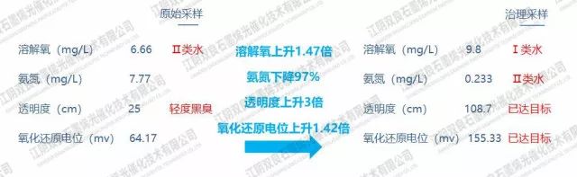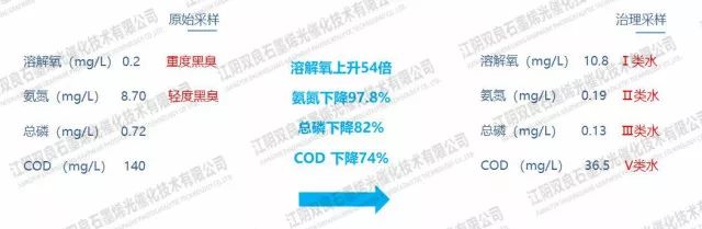 治理后已消除黑臭,并且水質指標已接近Ⅳ類水。gaP新型光催化網(wǎng)_水庫治理_河道治理_水生態(tài)修復_水環(huán)境治理與修復_江蘇雙良環(huán)境科技有限公司