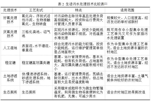 農(nóng)村生活污水末端治理工藝可分為生物處理技術(shù)和生態(tài)處理技術(shù)兩大類。生物處理技術(shù)主要包括好氧生物處理和厭氧生物處理兩大類;生態(tài)處理技術(shù)主要包括人工濕地、穩(wěn)定塘、土地滲濾系統(tǒng)。生態(tài)廁所是基于過程控制應用的技術(shù),其對黑水的后續(xù)處理起關(guān)鍵作用。生活污水處理技術(shù)具體的特點和適用范圍見表2。
