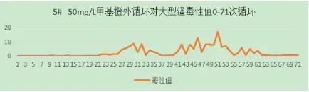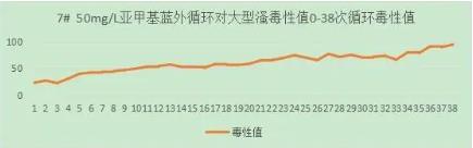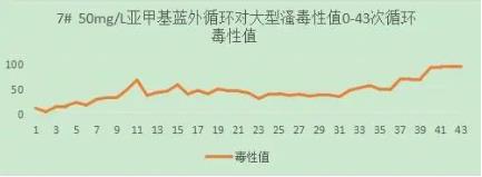 50mg/L亞甲基藍(lán)溶液外循環(huán),水槽中是否加入光催化網(wǎng)進(jìn)行對(duì)照試驗(yàn),60min/循環(huán),收集排水再循環(huán),4L。實(shí)驗(yàn)運(yùn)行43次循環(huán)。從大型溞毒性值與循環(huán)數(shù)的關(guān)系上,可以看出50mg/L亞甲基藍(lán)溶液對(duì)大型溞有較小影響。FNZ新型光催化網(wǎng)_水庫治理_河道治理_水生態(tài)修復(fù)_水環(huán)境治理與修復(fù)_江蘇雙良環(huán)境科技有限公司