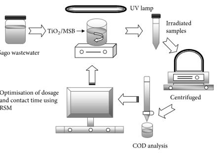 2/MSB混合物有較高的COD去除能力。此外,曝氣還使COD去除率進(jìn)一步提高了11%。模型的回歸值R2>0.99,表明評(píng)估參數(shù)之間存在高度的相關(guān)性。這些結(jié)果證明了TiO2光催化作為一種有吸引力的淀粉廠廢水處理替代方案的可行性,工業(yè)固體廢物可用于廢水降解。