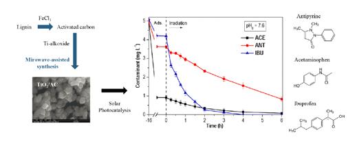 2、Degradation pathways of emerging contaminants using TiO2-activated carbon heterostructures in aqueous solution under simulated solar light